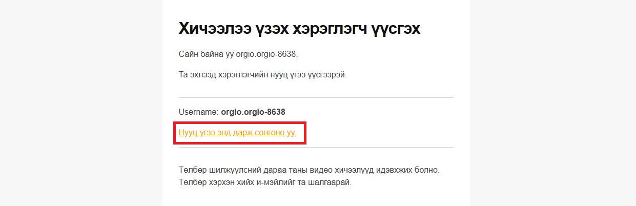 Хэрэглэгч, нууц үгээ үүсгээрэй гэсэн и-мэйл нэгээд та линк дээр дарж нууц үгээ тааруулаарай.